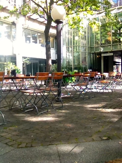 By the time we finished our meal, the patio was packed, and hopeful parties were waiting on the outskirts of the tables for a free one to appear out of the flagstones. Realizing it was getting late, my friend and I looked around for our waiter to get the check. But every time we saw him, he saw a different table that needed his attention. So we talked and we waited and waited and waited. I finally asked one waiter, and then another, and possibly even a third. My friend and I are patient people who've both worked in the service industry. We noticed that there were two (maybe three) waiters serving such a large space, which is difficult to manage during rush hour. Despite being Americans, we also both know that service in Germany is far different from service in America. German waiters make sure you have your drinks and food, and then leave you to your business unless they are needed, in which case you have to call them -- and that's okay. But even knowing all this, the time we had to wait for our check was a bit annoying, and whether from talking or waiting, I was shocked to see that by the time we left, we'd been there for four hours!