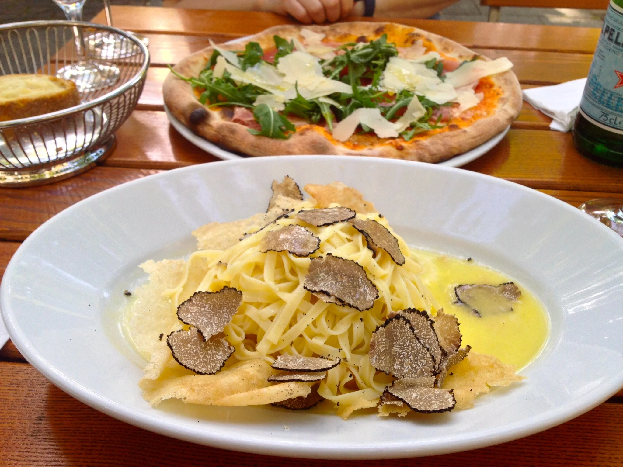 The pizza that came out was beautiful: golden thick edges with a thin bottom crust, paper-thin slices of parma ham, bright green arugula leaves, big snowflake chips of parmesan, all drizzled with olive oil. My pasta was similarly well presented: perfectly cooked tagliolini tossed in butter and served in an edible bowl of crispy fried parmesan and topped with delicate shavings of earthy black truffles. The parmesan crisp was a nice touch, and I enjoyed eating a bite of pasta with a slice of truffle and nibbling on a crispy parmesan chip. At times I thought there was a little too much butter, but it didn't stop me from eating the entire, delicious dish. It's certainly not something I could eat every day (my thighs would not be happy), but it was one of those decadent dishes that remind you it's truffle season in Italy, and so one must make the most of it.