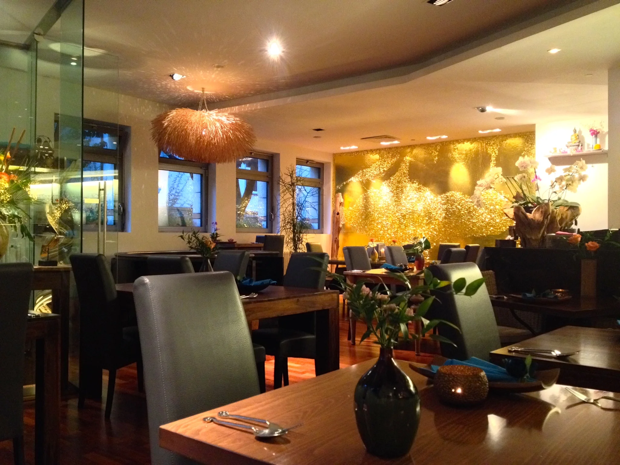 When we walked into Kanjana, I immediately noticed the decor. A stunning gold wall lined the back area to the left of the bar, while a blooming flower chandelier lighted the main entryway. On every block-wood table stood a vase with a green shoot or spray of flowers, and everywhere we saw orchids. I know that there are restaurants around Stuttgart that look just as stunning, but after spending the past few weeks in German pubs and at outdoor festivals, it was nice to be enveloped in such a lovely atmosphere for dining.